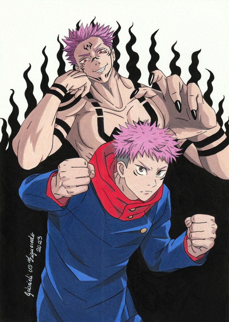 Sukuna e Yuji, 2023. Nanquim e lápis de cor s/ papel. 21×29,7 cm.